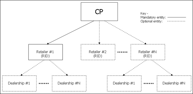 A CP must have at least one Retailer set up - this would usually correspond to their main brand (often one and the same as the CP). If the CP sold services under two or more brand names then each should be set up as a Retailer belonging to that CP - each would have an Ofcom allocated RID associated with it. There is no limit to the number of Retailers than be can associated with a CP. A Dealership, where applicable, can be set up underneath the Retailer it is related to. There is no limit to the amount of Dealerships that can be associated with a Retailer. Each different entity has a different level of access privileges: