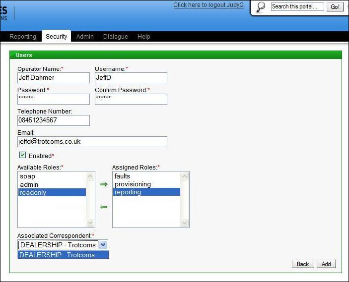 You are required to enter details for the user - their name and username; the username is what they will use to log in to the Portal with. A password can be set for them (which they'll be able to change themselves later, if necessary) and their contact details can be entered. Ensure the "Enabled" box is ticked and then assign their roles. Lastly the "Associated Correspondent" drop down box contains only the name of the Dealership. Once completed, click the "Add" button. The new user will now appear in the list of users on the "Security" page when logged in as the Dealership Administrator, see below: