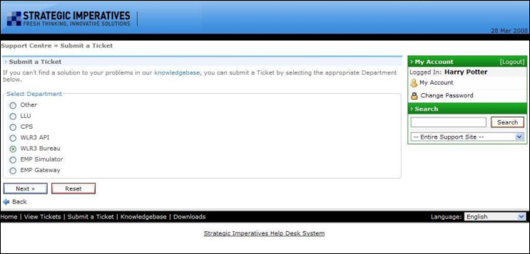To submit a ticket click on "Submit a Ticket" on the homepage, a screen will then be displayed from which the system the ticket relates to can be selected (Strategic Imperatives operate a number of systems), in the case of a ticket related to the Portal the option "WLR3 Bureau" should be selected, see below: