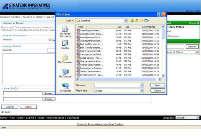 There is one final, optional section - this is the uploading of up to two supporting files to be associated with the Ticket. For issues with the Portal screenshots showing any relevant information to support the textual description of the problem are particularly welcome. To attach a file to the Ticket click the "Browse" button and select the file using the dialog box displayed, see below: