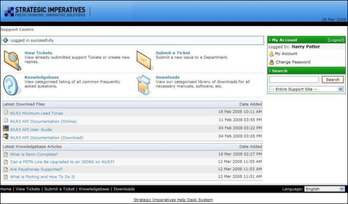When registering you will be prompted to enter your e-mail address, which becomes your username and a password. The registration request is forwarded to Strategic Imperatives, who approve requests for access. An e-mail is sent to the registered e-mail address when approval has been granted to confirm access is now available. When logged in the support home page is displayed, from which all the support options are available, see below: