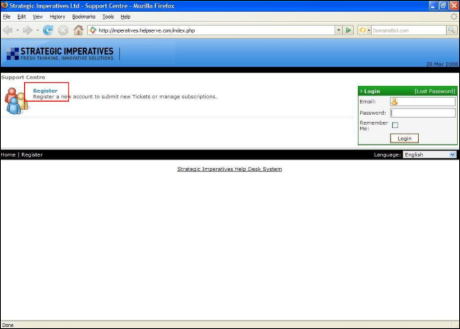 Strategic Imperatives provide a Support Centre where useful documentation is hosted, frequently asked questions are answered and a trouble ticketing system for the Portal is available. This Support Centre is accessed separately to the Portal, the web address is: http://imperatives.helpserve.com/index.php Access is via a username and password, which have to be requested prior to using the Support Centre - this can be done from the log in page, see below (the registration link is highlighted in the red box):