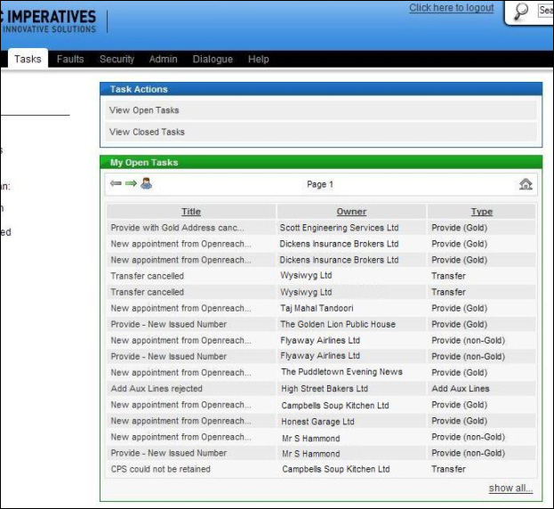 Shown on this screen is a longer list of recent "Open" tasks and also shortcuts to display either all "Open" or all "Closed" tasks. If "View Open Tasks" is selected then the "Open" tasks are displayed on screen - if there are too many to show on one screen then the results are split onto a number of pages which user can explore using the Page Forward and Page Back arrows, see below: