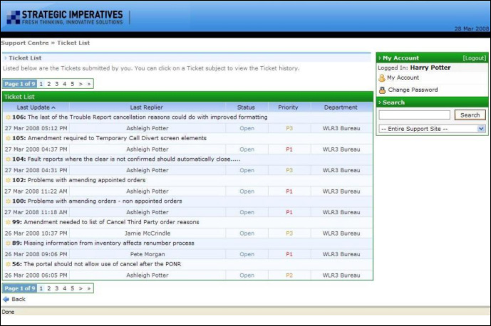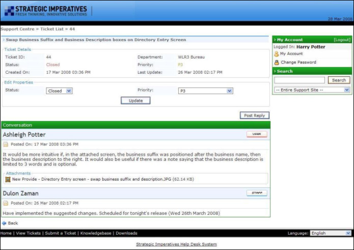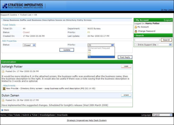 The full details of the ticket are shown, including the initial description and all subsequent replies. In the example above a Portal issue has been raised and one of Strategic Imperatives' developers has responded to the ticket and also marked it closed as this issue has been resolved. To update the status of a ticket (either "open" or "closed") or the priority of the ticket use the drop down boxes to select a new value, then click on the "Update" button, see below: